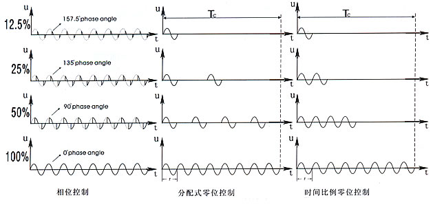 根據輸出電壓分布的不同,零位控制又分為分配式零位控制,既在Tc周期內根據輸出百分比平均分布周波;時間比例零位控制則在Tc周期內根據輸出百分比連續接通幾個周波,然后在Tc周期剩余的時間內連續關掉幾個周波。